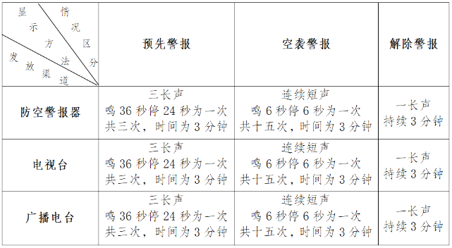 為檢驗人民防空警報設施性能是否良好,進一步增強市民的國防觀念和人防意識,根據《中華人民共和國人民防空法》有關規(guī)定和市國防動員辦公室國防工作安排,我區(qū)定于9月18日10時30分至11時00分進行防空警報試鳴。屆時,防空警報器將向廣大群眾發(fā)出“預先警報”、“空襲警報”和“解除警報”三種防空警報信號,各種信號鳴放1次(見下表)。望廣大群眾聽(看)到防空警報信號時,不要驚慌,注意聽辨,照常工作和活動。